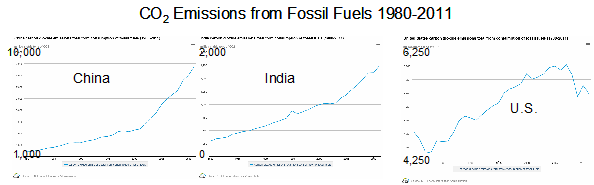 Economic growth depends critically on use of energy. In 1997, the year that Kyoto was signed, energy use in China and India , while growing, were still very low, much lower than that of the U. S. , as seen in the graphic below.